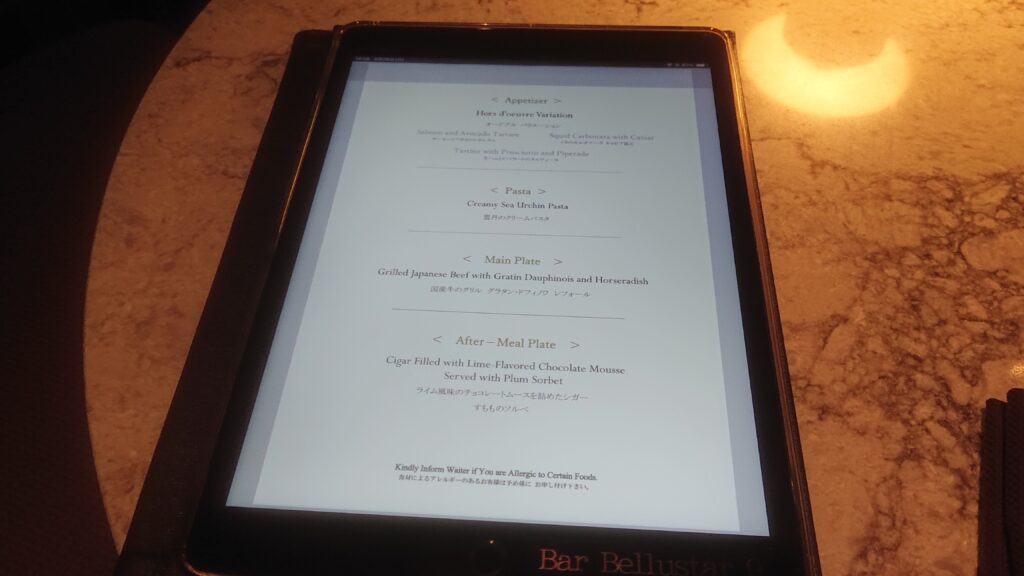 コース限定カクテルメニューと、その他の飲み物メニューです。フィーバーツリーのジンジャービアは最後に飲みたかったですが、結構満腹だったので泣く泣く諦めました。