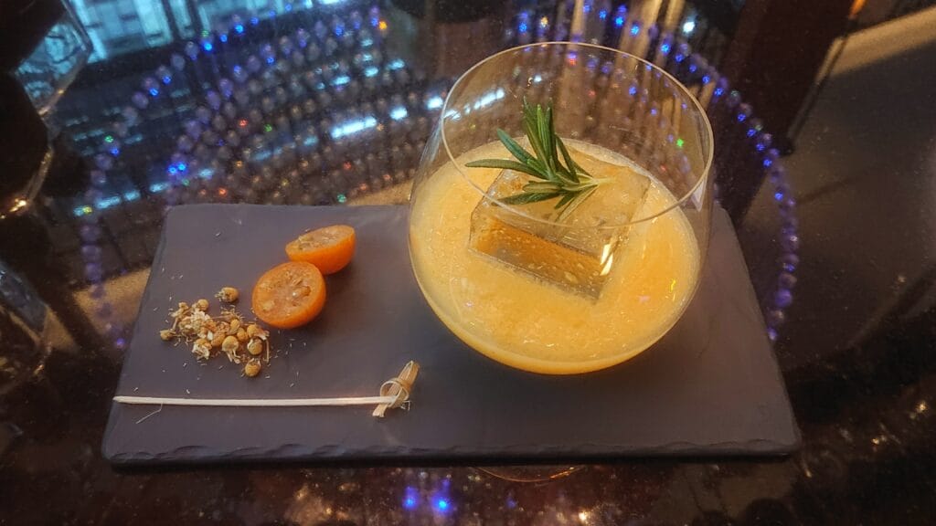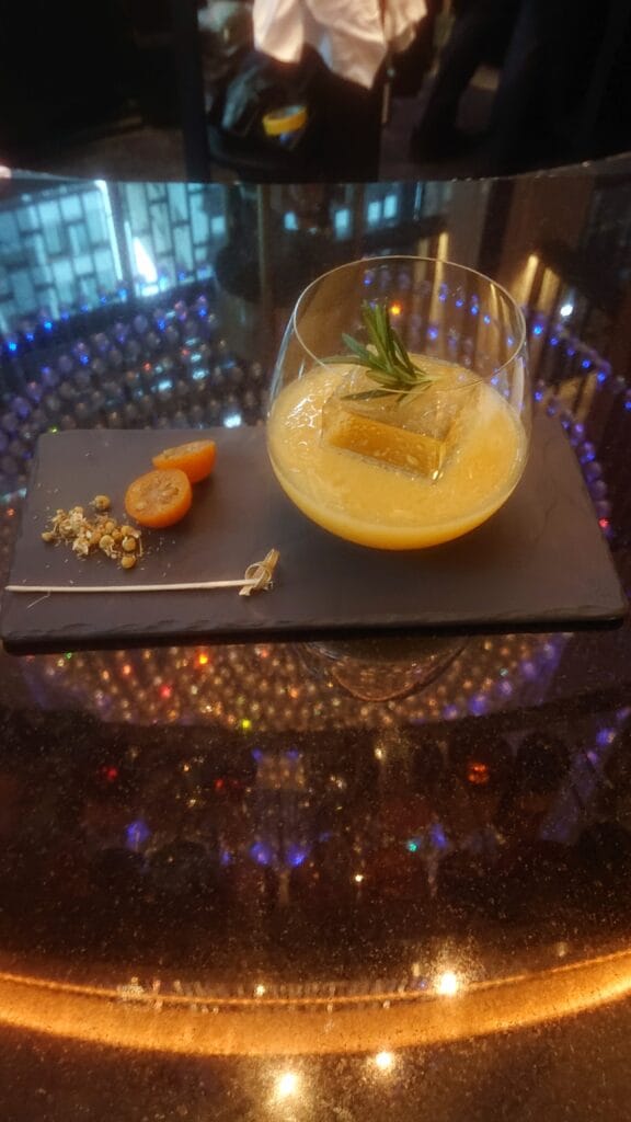 飲みながら、合間に金柑をいただき、楽しみました。家ではまず飲めないカクテルですね。
