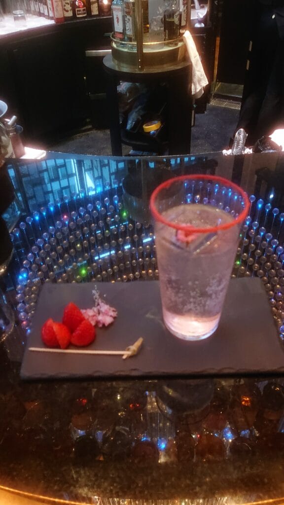グラスの縁にはストロベリーパウダーのスノースタイル。塩味はなく、ほんのり苺の香りがします。